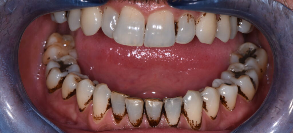 TRIANGLES NOIRS ENTRE LES DENTS : les triangles noirs entre les dents doivent être nettoyés par des brossettes, dont le diamètre sera augmenté après le surfaçage. Sachez que si rien n’est fait, ces triangles noirs artificiellement masqués par la gencive gonflée / infectée ne vont faire que grossir. Plus le traitement à lieu tôt, plus les triangles noirs seront inexistants ou petits. Plus le traitement est tardif plus les triangles noirs, qui correspondent au volume d’os perdu, « mangé » par la parodontite, vont être volumineux.