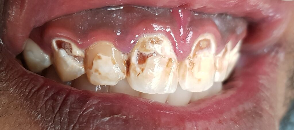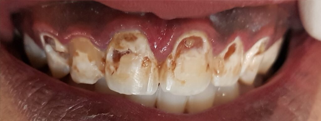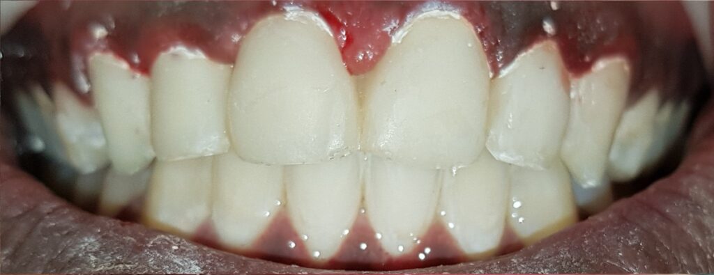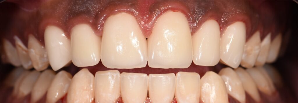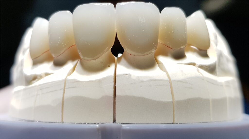 Prothèse Céramique ( E-Max ) sur le model en plâtre : On note le passage de la lumière au travers des couronnes sans l’ombre métallique présente sur les couronnes Céramo-Métalliques